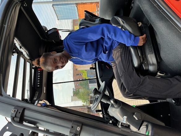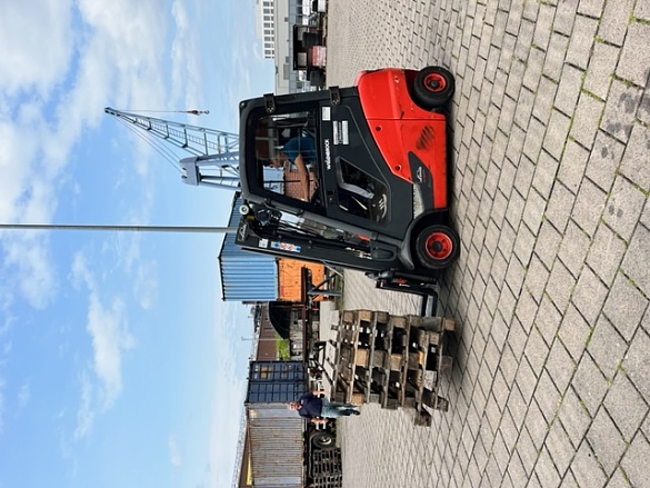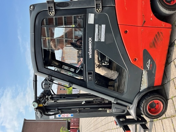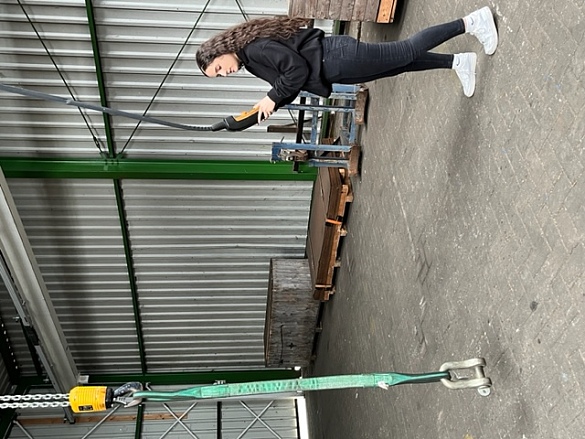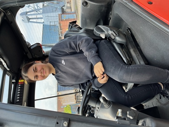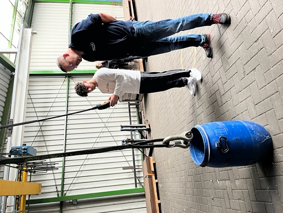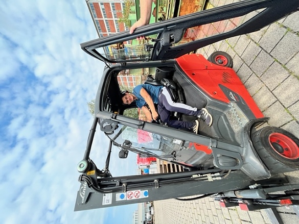 Die SuS konnten nach einer kurzen Einführung einen Gabelstapler fahren und sogar Paletten anheben und transportieren. Hierbei waren alle aktiv, die Mädchen waren so begeistert, dass sie mehrmals fahren wollten. Der zweite praktische Teil war eine Kranfernbedienung zu navigieren und einen Gegenstand exakt in eine Tonne zu platzieren.